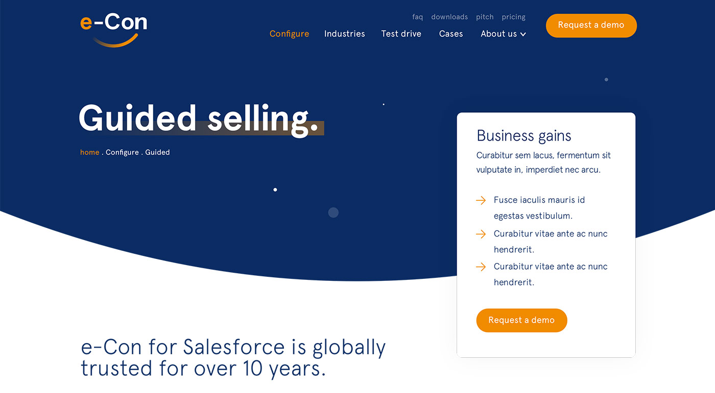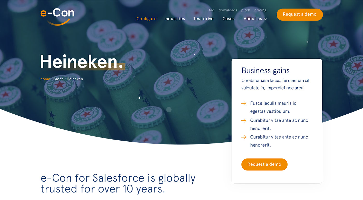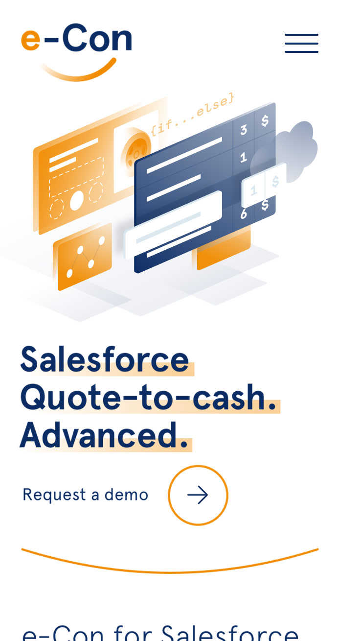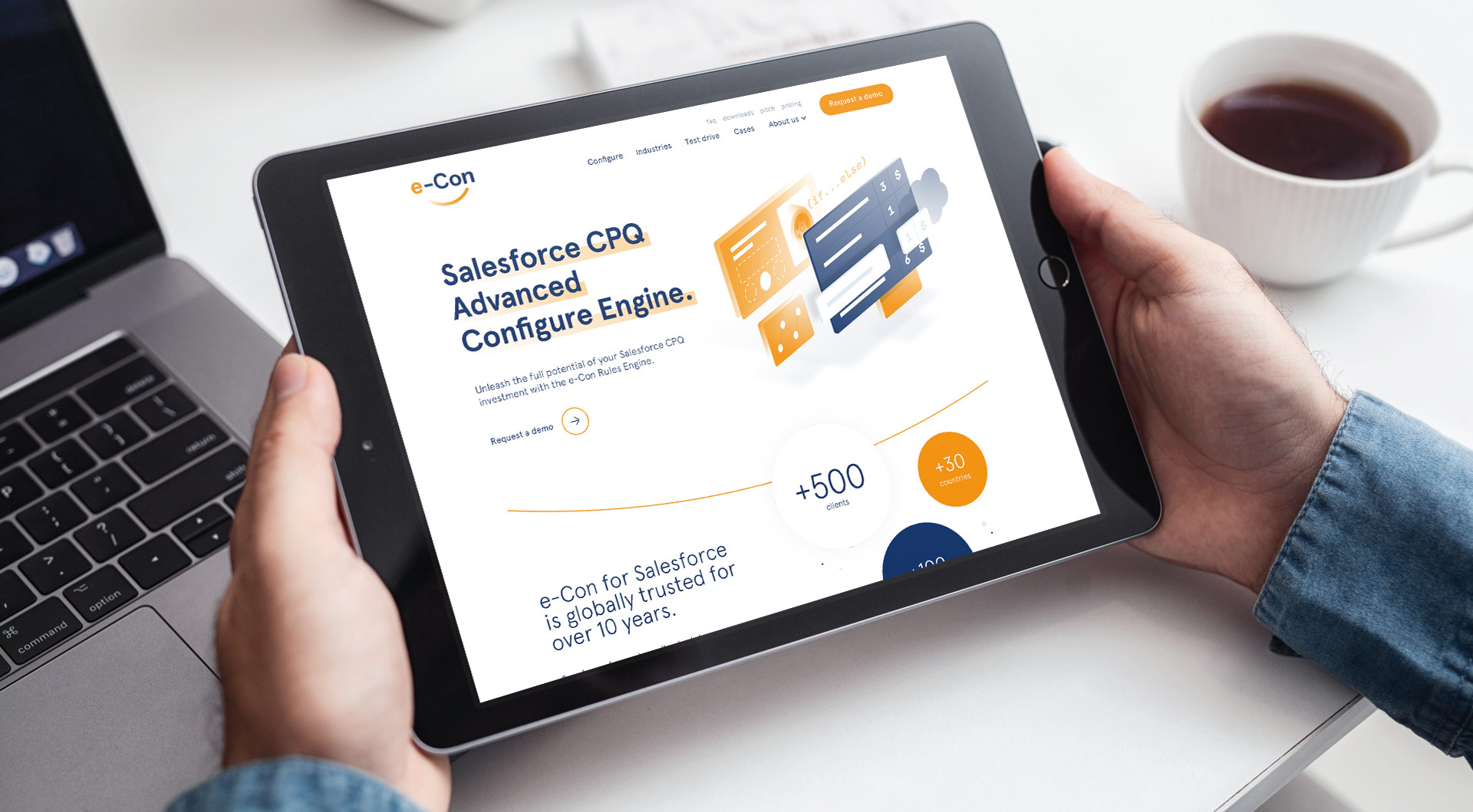 e-Con Solutions (leverancier van software om op maat gemaakte producten en diensten eenvoudig en nauwkeurig te verkopen) vroeg ons vorm te geven aan een nieuw label 'e-Con for Salesforce'. Mandelo zette een volledig nieuwe positionering neer (met knipoog naar de visuele identiteit van de moederonderneming).